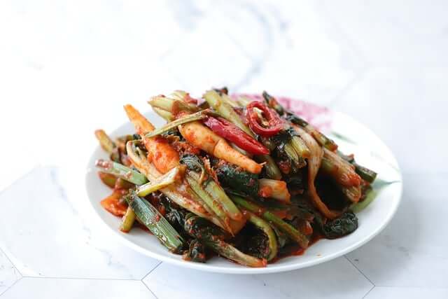 배추, 무, 오이, 갓, 파 등 다양한 채소를 소금에 절이고 양념을 묻혀 발효한 식품으로 위와 장에 좋고 소화가 잘 되며 항산화, 항암, 고혈압 예방의 효과도 있습니다.