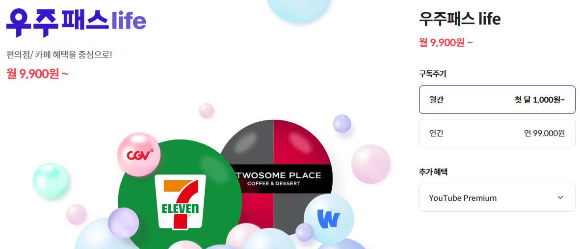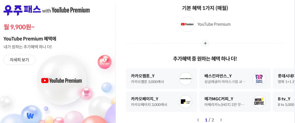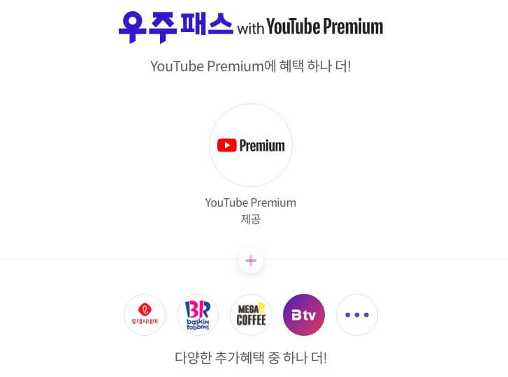 우주패스의 경우, 현재 월 9,900원에 유튜브 프리미엄과 추가요금 없이 무려 6가지 중 한 가지 추가 혜택도 받을 수 있습니다.