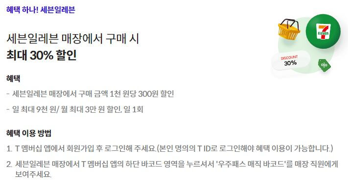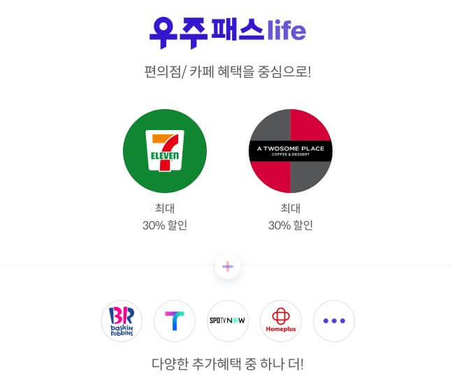 저는 2023년 초부터 이 우주패스 life를 쓰고 있습니다. 평소 카페와 편의점을 가는데 30% 할인을 해주기 때문이에요.