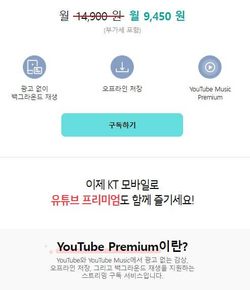 KT OTT 구독 유튜브 프리미엄 : 9,450원