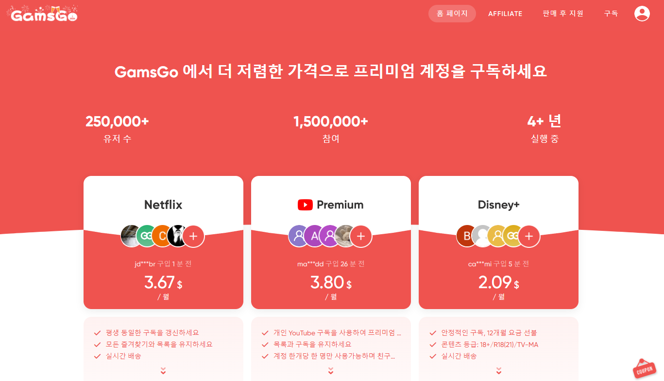 겜스고(GamsGo)는 OTT 구독 중개 플랫폼으로 전 세계 25만 명의 유저가 사용하고 있습니다. 수많은 사용자가 말해주듯 합법적인 서비스로 믿음을 주고 사용 안정성 면에서 신뢰도가 있는 플랫폼입니다.