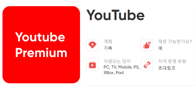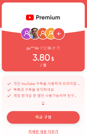 또한, 가족요금제로 운영되어 가격이 저렴합니다. 유튜브 가족 요금제는 최대 5명을 가족 구성원으로 묶어 유튜브 프리미엄을 함께 사용하는 서비스로 가격이 저렴하지만 우리나라에서는 지원을 하지 않는데요, 겜스고에서 가족요금제로 가입할 수 있습니다.