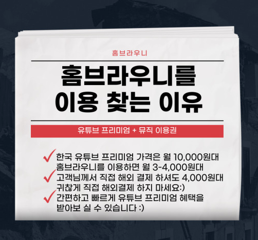 홈브라우니를 이용하면 유튜브 프리미엄을 월 3,000원 ~ 4,000원대로 저렴하게 이용할 수 있습니다.